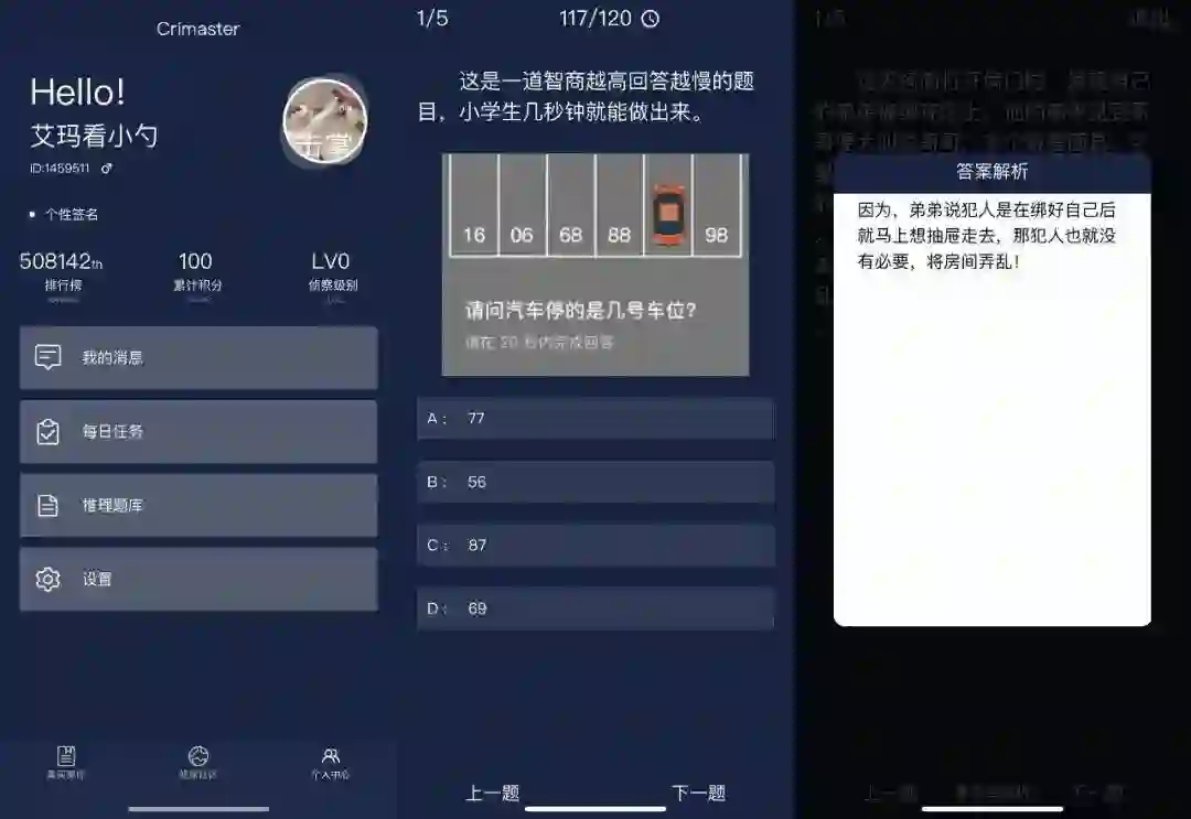 显示用户当前排名、累计积分和侦察级别。每日任务和推理题库下,用户每天可分别侦破5道题目。