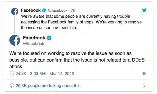 我们了解到一些用户目前无法访问 Facebook 系列应用程序。我们正在努力尽快解决问题,目前可以确认这次的问题并不是 DDoS 攻击。