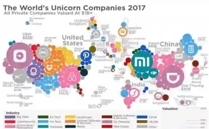 独角兽公司被视为新经济发展的一个重要风向标,代表着科技转化为市场应用的活跃程度。因此它们主要出在高科技领域,互联网领域尤为活跃。