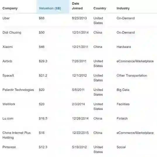 CB Insights被称为美国硅谷VC数据智库,是全球风投机构的风向标。榜单显示,Uber以680亿美元估值成为全球最具价值的科技创业公司,来自中国的滴滴出行、小米分别以500亿美元、460亿美元估值位列第二、三位。