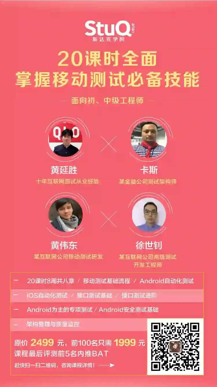 黄延胜老师等四位资深测试开发工程师即将开讲《移动测试必备技能》课程啦!