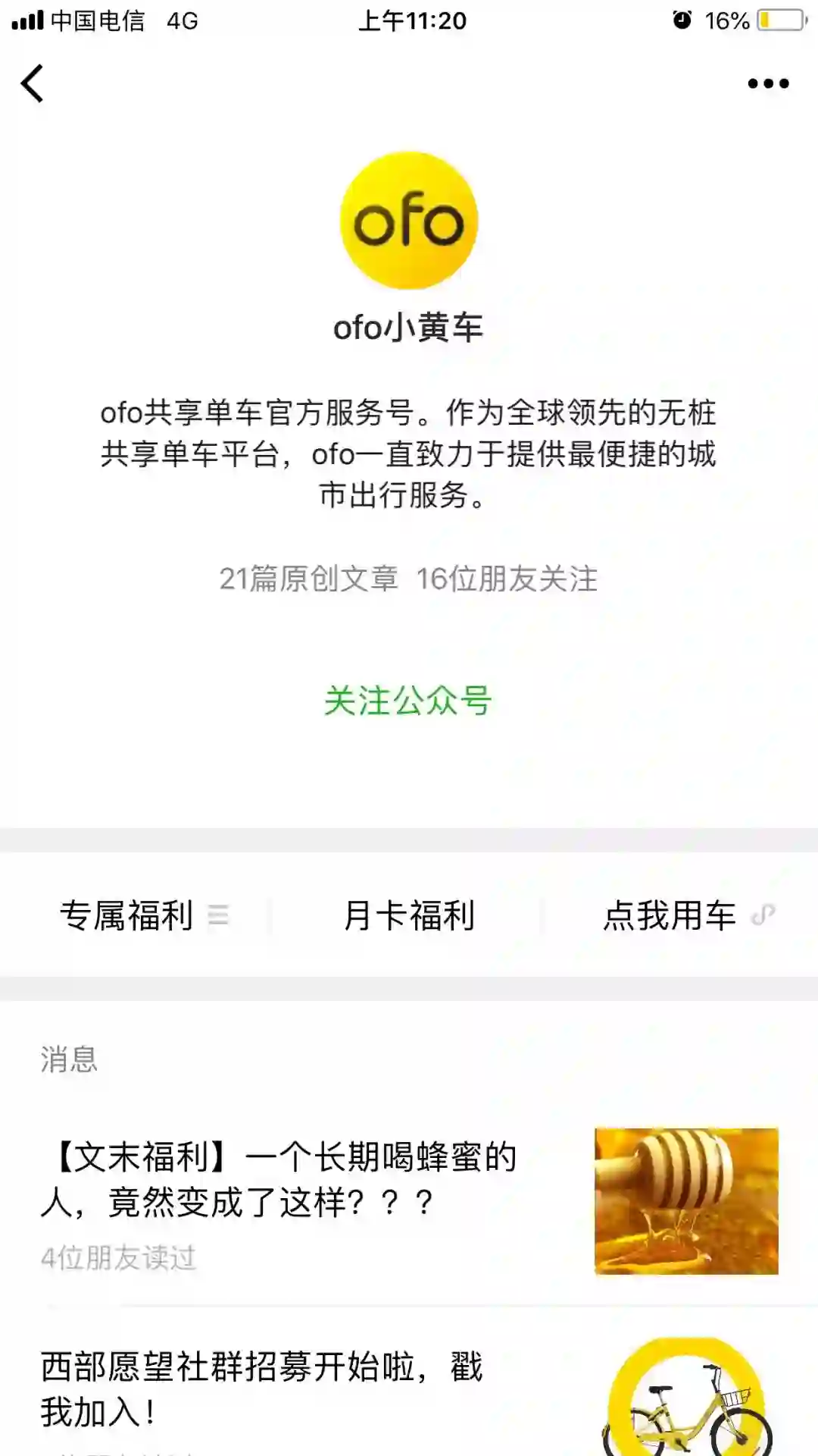 综合消息 9天没有更新的「ofo小黄车」公众号,11月19日12时37分发布推送,头条标题为《一个长期喝蜂蜜的人,竟然变成了这样???》,讲述了养蜂人杨小花的故事,文末还附上杨小花个人微信二维码,读者可扫码购买蜂蜜。文章推送后不到2小时,阅读量就破了10万。AI财经社向ofo方面询问此文是否为ofo的商务合作搞,对方并未回应。