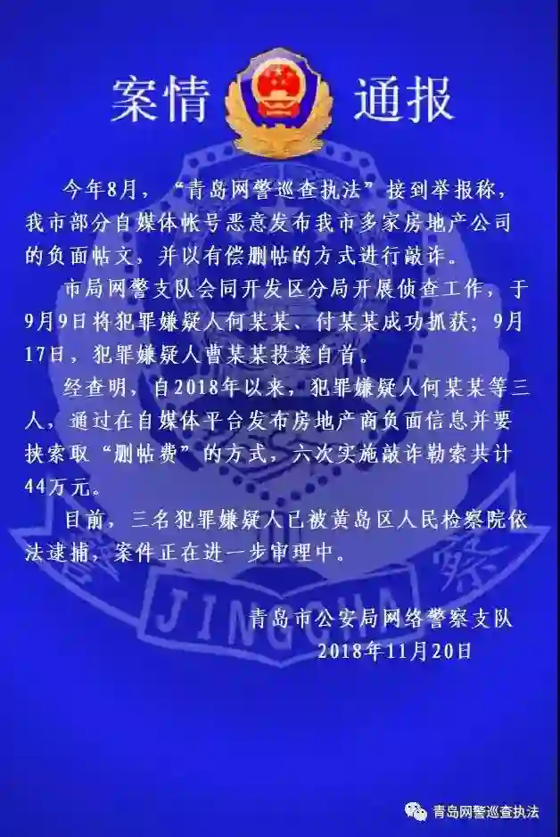 据齐鲁网 11月20日,青岛市公安局网络警察大队发布案情通报,自2018年以来,犯罪嫌疑人何某某等三人,通过自媒体平台发布房地产商负面信息并要挟索取“删帖费”的方式,六次实施敲诈勒索共计44万元。目前,三名犯罪嫌疑人已被黄岛区人民检察院依法逮捕,案件正在进一步审理中。