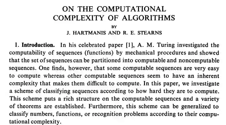 这篇论文开辟了计算机科学的一个新的研究领域,即「计算复杂性」,并奠定了它的理论基础,也让Hartmanis和Stearns最终拿到了图灵奖。