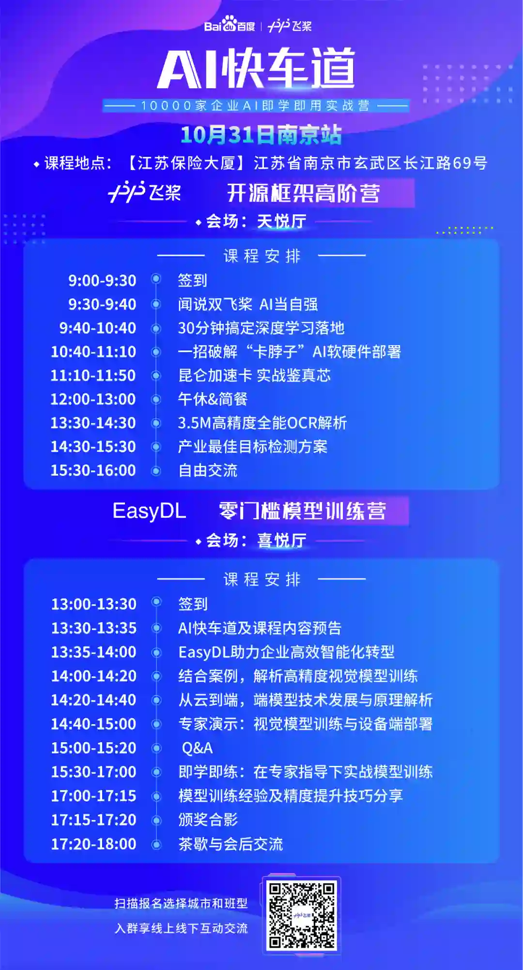 10月31日,AI快车道来到六朝古都南京,依托桨声灯影里的秦淮河,为这座历史悠久的城市带来AI科技的新气息!现场名额有限,立即扫码或点击“阅读原文”报名哦!