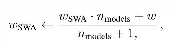 在每个学习率周期的末尾,第二个模型的当前权重将用来更新第一个模型的权重(公式如上)。因此,在训练阶段,只需训练一个模型,并在内存中储存两个模型。预测时只需要平均模型,基于其进行预测将比之前描述的集成快很多,因为在那种集成中,你需要使用多个模型进行预测,最后再进行平均。