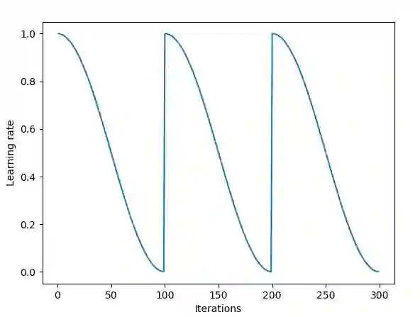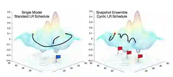 最初,SGD 会在权值空间中跳出一大步。接着,由于余弦退火,学习率会逐渐降低,SGD 将逐渐收敛于某个局部解,算法将保存一个模型的「快照」,把它加入集成模型。接着学习率重置为高值,SGD 再次迈一大步,找到另一个局部极值,以此类推。