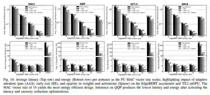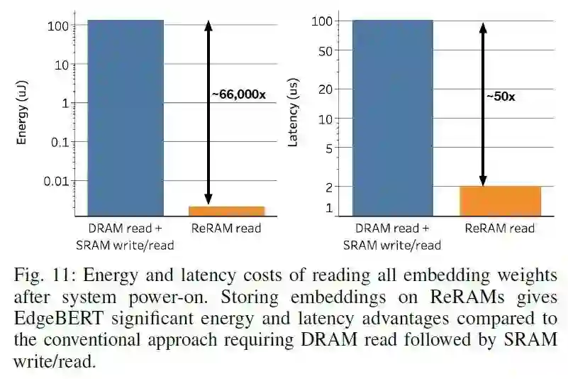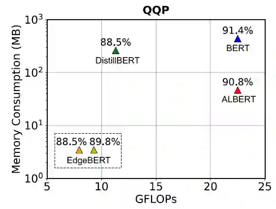 在性能(准确度)相比 ALBERT 下降 1 个百分点时,EdgeBERT 能取得的内存降低和的推理速度;下降 5 个百分点时甚至能取得的推理速度。