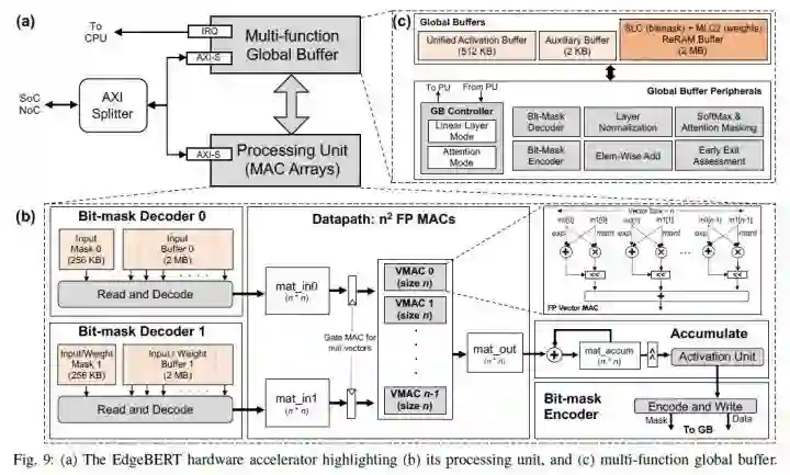 嵌入层:保存了 Embedding 向量。EdgeBERT 在进行下游任务 fine-tune 时一般不对嵌入层进行修改。这类参数相当于只读参数,只对快速读取有较高要求,同时希望能够在掉电时依然保持原有数据来降低数据读写开销,因此适用耗能低、读取速度快的 eNVM(Embedded Non-Volatile Memory,嵌入式非挥发性记忆体)。本文选取的是基于 MLC 的 ReRAM,一种低功耗、高速度的 RAM。