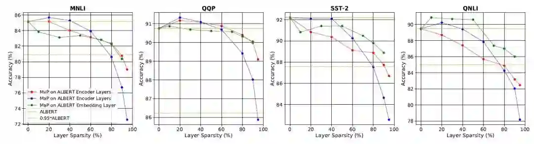 QQP 的 Transformer 参数被 mask 掉 80%,MNLI、SST-2、QNLI 的 Transformer 参数被 mask 掉 60% 后,性能可以仅下降 1 个百分点。