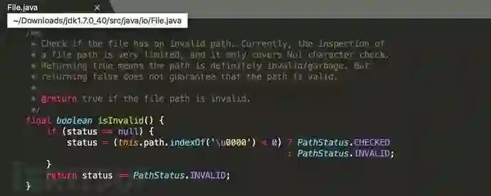 修复前(Java SE 7 Update 25)和修复后(Java SE 7 Update 40)的对比会发现Java SE 7 Update 25中的java.io.File类中并未添加\u0000的检测。