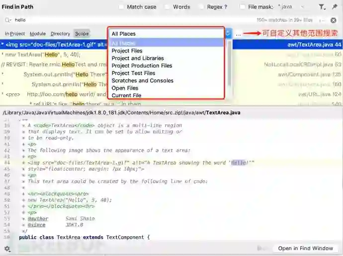 IDEA可以通过自定义搜索范围来精确查找我们需要审计的代码。默认搜索的是所有的位置,不过我们可以点击红色箭头指向的…按钮来细化我们的搜索范围。