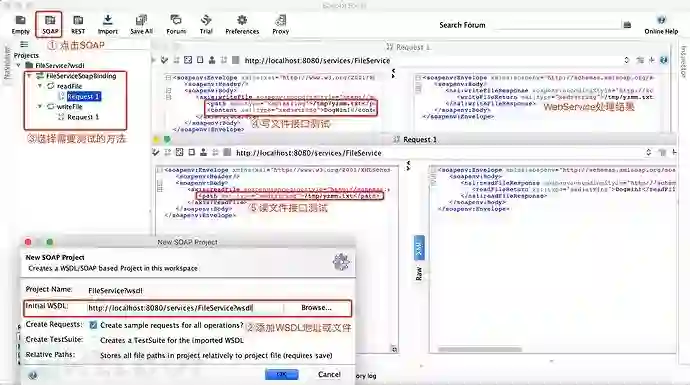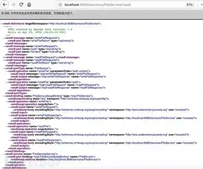 访问Web Service的FileService服务加上?wsdl参数可以看到FileService提供的服务方法和具体的参数信息。