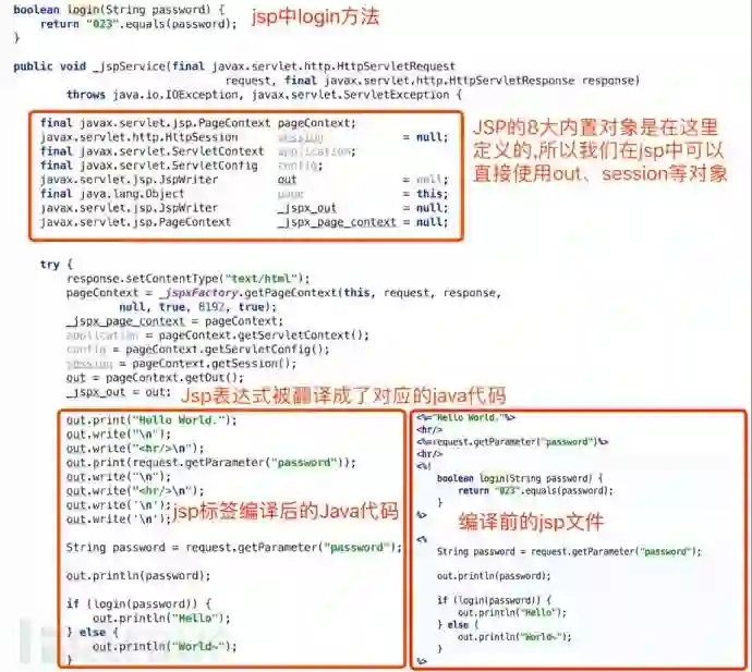 JSP文件会被编译成一个java类文件,如index.jsp在Tomcat中Jasper编译后会生成index_jsp.java和index_jsp.class两个文件。而index_jsp.java 继承于HttpJspBase类,HttpJspBase是一个实现了HttpJspPage接口并继承了HttpServlet的标准的Servlet,jspService方法其实是HttpJspPage接口方法,类似于Servlet中的service方法,这里的jspService方法其实就是HttpJspBase的service方法调用。