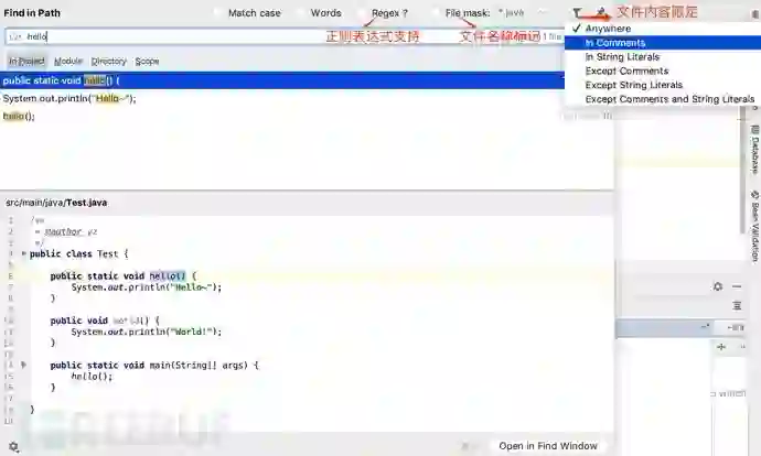 IDEA的搜索快捷键是:⇧⌘F,使用IDEA提供的搜索功能可以非常快速的定位漏洞点信息。