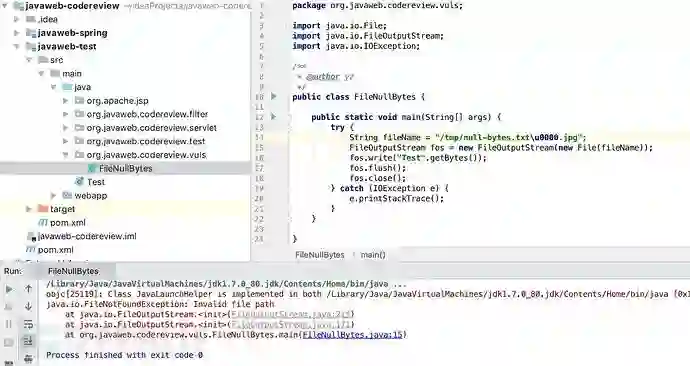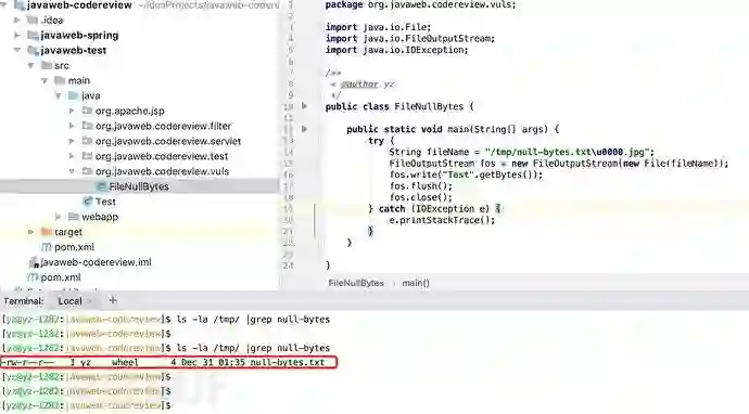 空字节截断漏洞漏洞在诸多编程语言中都存在,究其根本是Java在调用文件系统(C实现)读写文件时导致的漏洞,并不是Java本身的安全问题。不过好在高版本的JDK在处理文件时已经把空字节文件名进行了安全检测处理。