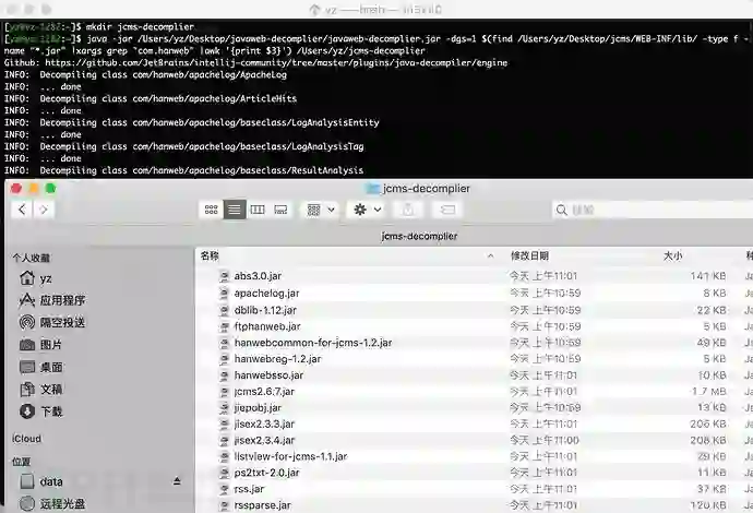 java -jar /Users/yz/Desktop/javaweb-decomplier/javaweb-decomplier.jar -dgs=1 $(find /Users/yz/Desktop/jcms/WEB-INF/lib/ -type f -name "*.jar" |xargs grep "com.hanweb" |awk '{print $3}') /Users/yz/jcms-decomplier