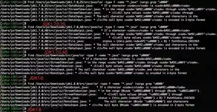 受空字节截断影响的JDK版本范围:JDK<1.7.40,单是JDK7于2011年07月28日发布至2013年09月10日发表Java SE 7 Update 40这两年多期间受影响的就有16个版本,值得注意的是JDK1.6虽然JDK7修复之后发布了数十个版本,但是并没有任何一个版本修复过这个问题,而JDK8发布时间在JDK7修复以后所以并不受此漏洞影响。