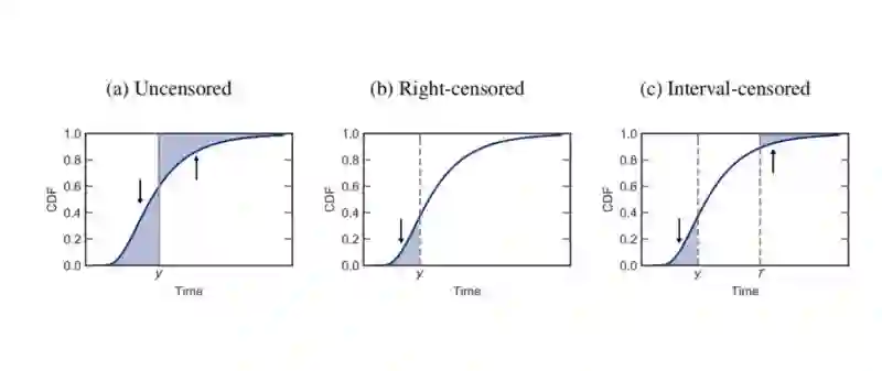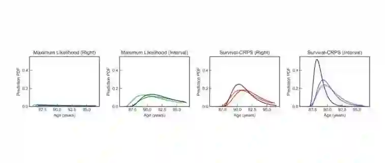 对比之下气象学预报通常是基于过去和目前的观测情况,对所有的天气情况作出全面的预测分布。预测结果由最大化预测分布的锐利程度来评价。一个预测分布的有用程度体现在它的锐利程度中,即数据的聚集程度。为了提高预测分布曲线的锐利程度,我们提出采用优于最大似然法的适当评分法则(Proper Scoring Rule)作为训练的目标函数。我们将 CRPS 扩展至生存问题中,定义为 Survival-CRPS,并且分别进行了数据右删失和间隔删失的延伸。