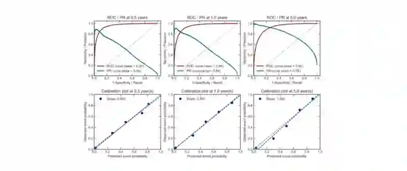 通过对死亡时间的整体预测,这个模型也可以应用于对不同时间点进行预测。当预测 6 个月、1 年和 5 年内的死亡概率时,我们的模型可以保持很好的校准度,以及极高的区分度。