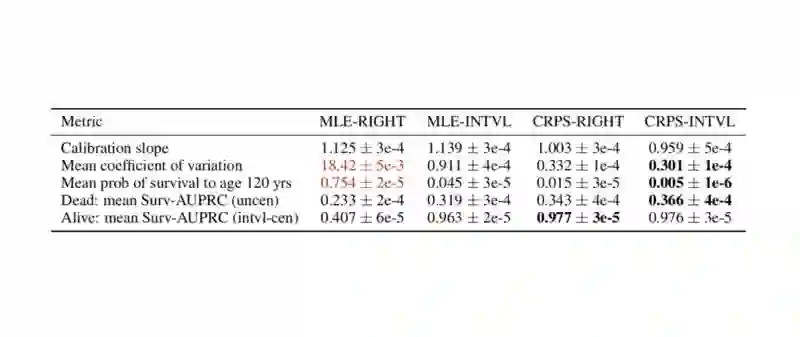我们在死亡预测任务上进行实验,评估四个不同的训练目标:最大似然 S-MLE-RIGHT 和 S-MLE-INTVL,以及基于我们提出的评分法则的损失函数:S-CRPS-RIGHT 和 S-CRPS-INTVL。