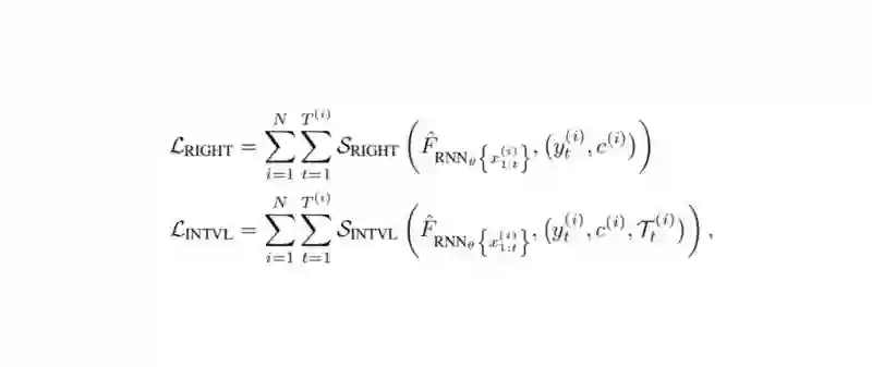 我们通过构建一个多层循环神经网络,将提出的方法应用在死亡预测任务中。网络输入为特征序列(EHR 中的病人信息),来预测概率分布函数 F 的参数。该网络只依赖目前和之前的时间点数据,不依赖未来的数据。每个时间点输出的概率分布构成整体损失: