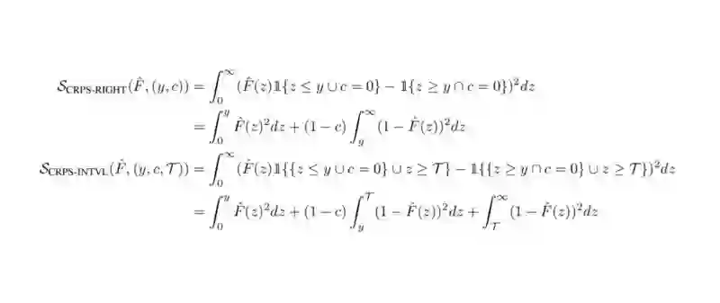 为了预测事件发生所需时间,我们提出了 Survival-CRPS,用于计算右删失或间隔删失数据的概率:
