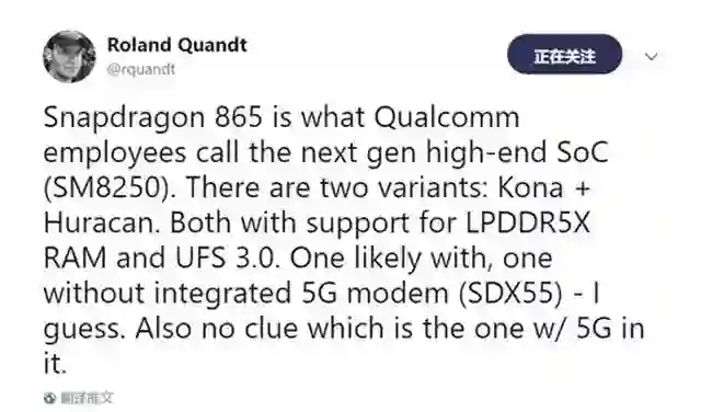 外媒知名爆料人士称,骁龙865代号为SM8250,很有可能延续前代产品采用7nm制造工艺。与前代不同的是,骁龙865将有两个型号,均支持LPDDR5X内存及UFS 3.0闪存,区别在于一个支持5G,另一个支持4G LTE网络,不支持5G。有网友认为这样的设计是合理的。