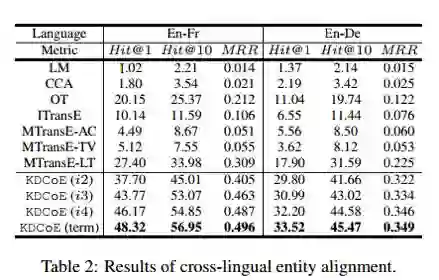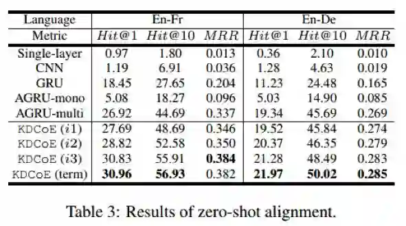 (2)证明KDCoE在Zero-shot实体对齐以及跨语言知识图谱补全(Cross-lingual KG Completion)任务上的有效性;