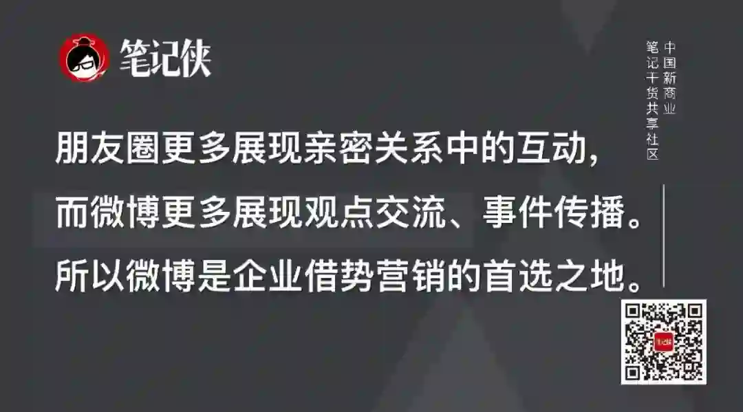朋友圈展现的是亲密关系中的互动,而微博更多展现的是观点交流、事件传播。所以微博是企业借势营销的首选之地。