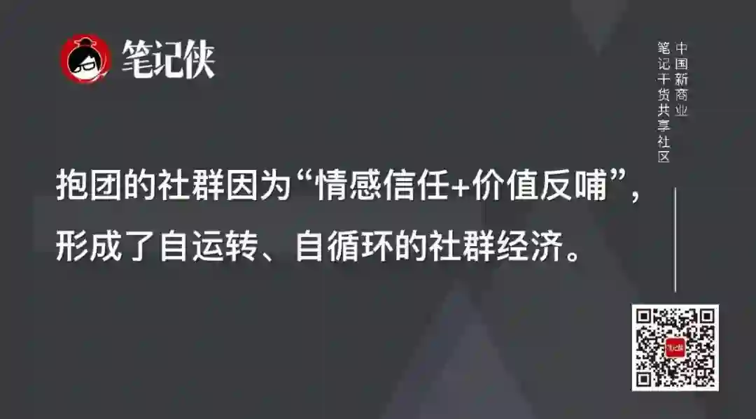 相对于某个产品或者某个品牌来说,这种抱团的社群因为“情感信任+价值反哺”,共同作用形成了自运转、自循环的范围经济系统,这就是社群经济。