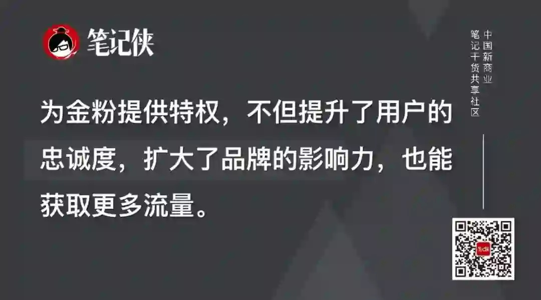 他们就像是企业和用户之间的强力胶,拥有他们,就等于拥有了更多的用户。为金粉提供特权,不但提升了用户的忠诚度,扩大了品牌的影响力,也能获取更多流量。