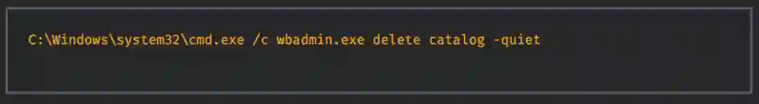 接下来,再次利用主机上的cmd.exe执行,我们可以看到恶意软件作者使用wbadmin.exe;有必要向不熟悉wbadmin的读者解释一下,这是现代操作系统上的ntbackup的替代者。