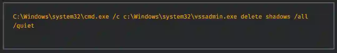 该恶意软件的破坏性部分在受害者机器上初始执行期间就开始了。正如讨论的那样,初始的恶意软件执行导致多个文件写入到磁盘。在此之后,恶意软件通过开始执行恶意破坏性部分,继续传播开来。通过利用主机上的cmd.exe,恶意软件先使用vssadmin删除系统上所有可能的卷影副本: