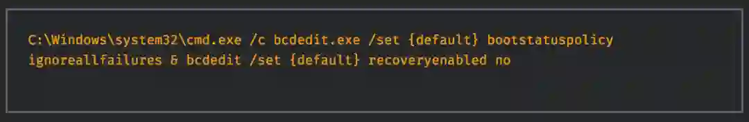 攻击者在这条破坏性路径上采取的下一步是再次利用cmd.exe,但这回使用bcdedit(一种用于启动配置数据信息的工具),确保Windows恢复控制台并不试图修复主机上的任何内容。