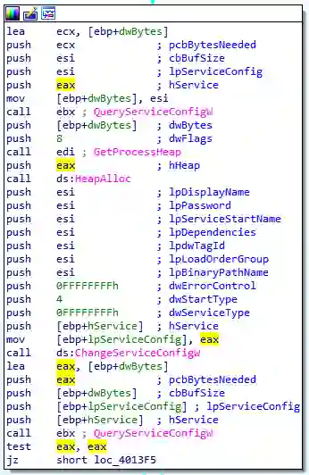 该恶意软件使用ChangeServiceConfigW API,将启动类型改为4,这意味着:“Disabled:Specifies that the service should not be started.”