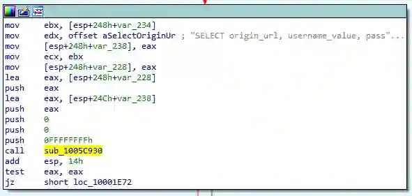 Olympic Destroyer投放了浏览器登录信息窃取模块。最终的有效负载嵌入在有意混淆的资源中。样本要执行,必须有如前所述的2个参数。窃取模块支持:InternetExplorer、Firefox和Chrome浏览器。恶意软件解析注册表,会查询sqlite文件以便检索已存储的登录信息。SQLite嵌入在样本中: