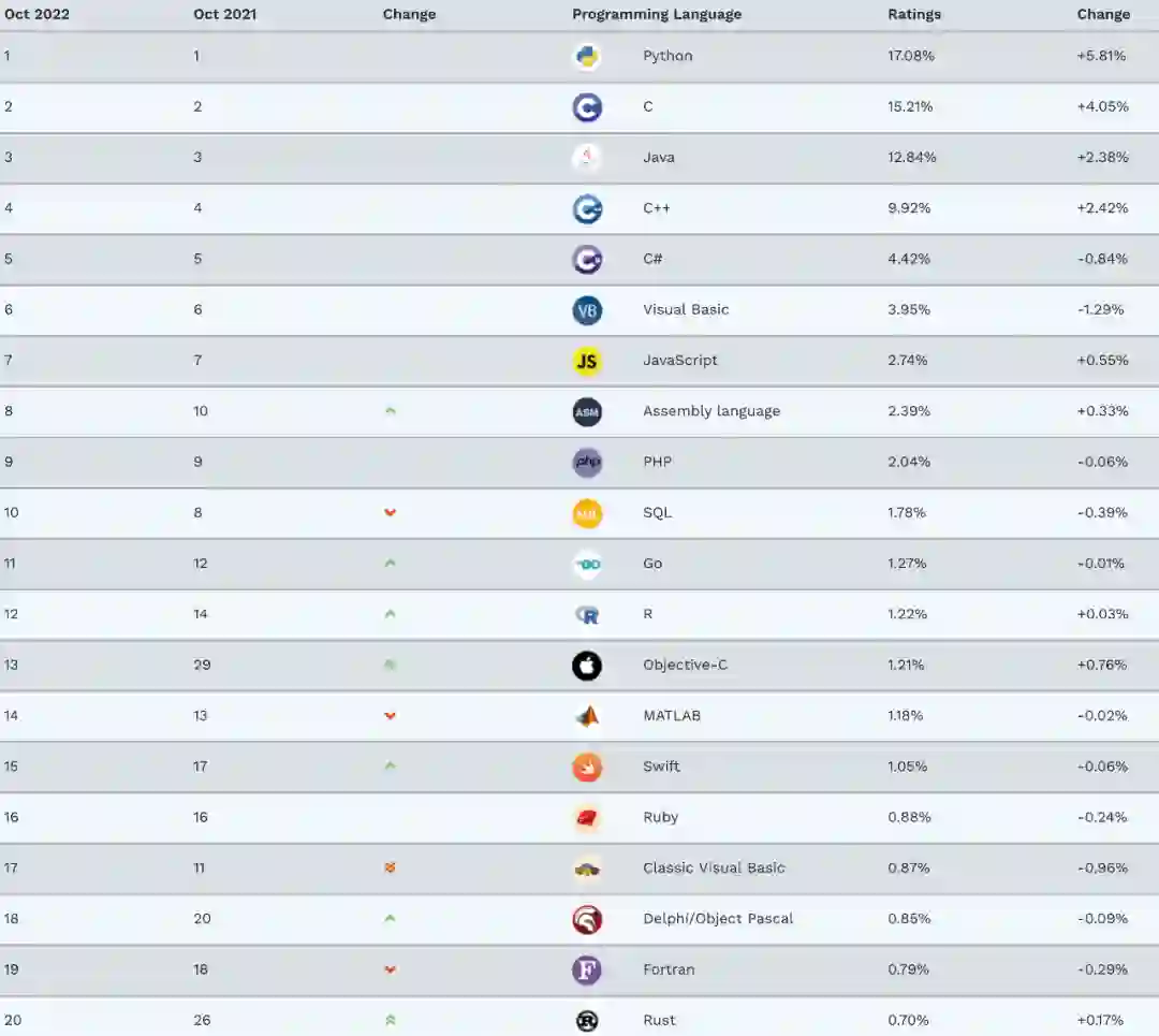 TIOBE CEO Paul Jansen 对此趋势的发展做出这样的评价,「Java 的主要竞争对手 C# 正在逐步丢失自己的市场份额,而 Python 的竞争对手 R 和 Ruby 则或多或少地稳定下来。然而,对于 C 和 C++ 而言,有一个小小的威胁出现了,那就是编程语言 Rust。Rust 以 0.70% 的历史最高市场份额再次进入了榜单的 Top 20 名。」
