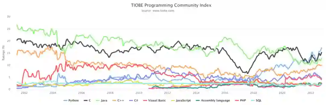 Top 10 编程语言 TIOBE 指数走势(2002-2022)