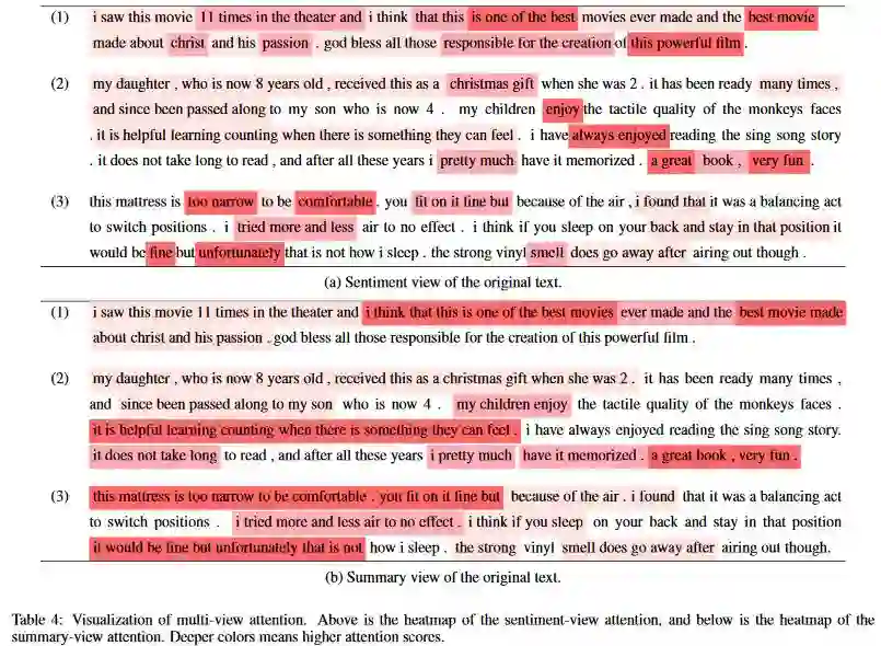 2. multi-view attention mechanism:由于该模型为联合任务,而情感分类和文本摘要对于文本的抽取是应该有区别的,比如,情感分类专注于情感性强的词,文本摘要专注于关键性强的词。所以对encode的信息需要进行权重加权。