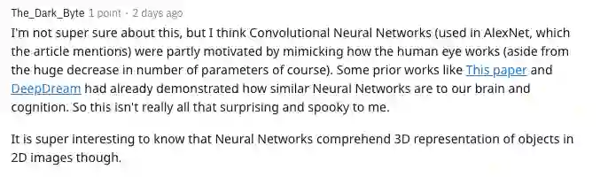 但有人却认为这没什么大惊小怪的:「我对此不太确定,但我认为卷积神经网络(AlexNet)在某种程度上是通过模仿人眼的工作方式来实现的(当然,除了参数数量的大量减少之外)。诸如本文和DeepDream之类的一些先前工作已经证明了神经网络与我们的大脑和认知有多么相似。因此,这对我来说并不是真的那么令人惊讶和恐怖。」
