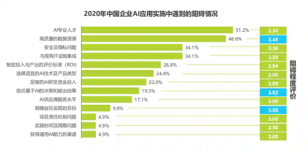 然而,缺乏AI人才(51.2%)和高质量的数据资源(48.8%),是推进人工智能的探索应用中遇到的主要障碍。人才紧缺和数据质量,成为了企业推动AI项目实施亟待解决的首要问题。