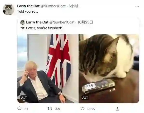 约翰逊宣布退出后,唐宁街首席捕鼠官“拉里猫”在官方账号调侃:早和你说过了