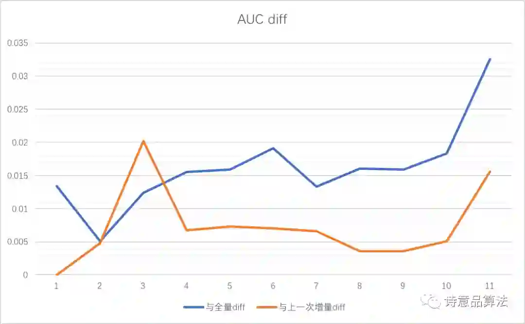 我们可以得到每一次增量训练过程中的最优AUC(或者固定epoch的AUC),与全量版本的AUC和上次增量版本的AUC进行比较,得到离线的AUC diff。这里的AUC评估基于同一份验证集,因此完全可比。下面给出本次增量 VS 全量以及本次增量 VS 上次增量AUC的diff: