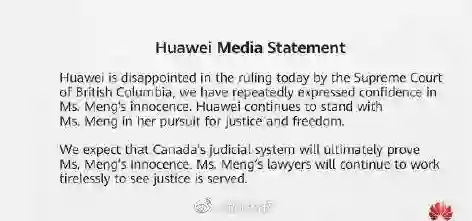 5月28日消息,加拿大不列颠哥伦比亚省高等法院温哥华当地时间27日上午(北京时间28日凌晨)公布了孟晚舟引渡案的第一个判决结果,认定华为公司副董事长、首席财务官孟晚舟符合“双重犯罪”标准,因此对她的引渡案将继续审理,孟晚舟女士将留在加拿大参加后期的相关听证,并等待新的审判结果。孟晚舟女士当天出庭并听取法庭所做的判决。对此,华为发表如下声明:我们对不列颠哥伦比亚省高等法院的判决表示失望。我们一直相信孟女士是清白的,我们也将继续支持孟女士寻求公正判决和自由。我们希望加拿大的司法体系最终能还孟女士清白。孟女士的律师团队将不懈努力,确保正义得到伸张。