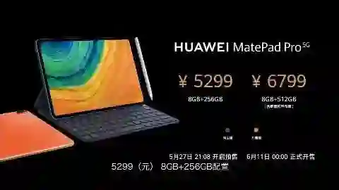 5月27日讯,华为发布国内首款5G平板电脑华为MatePad Pro 5G,搭载麒麟990 5G SoC旗舰芯片,7nm+EUV制程工艺。今日开启预售,8GB+256GB售价5299元,8GB+512GB售价6799元。