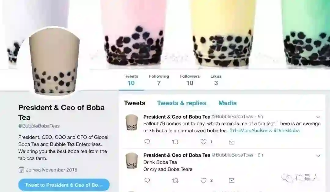 还没从奶茶带来的文化冲击里缓过来的美国推友还为奶茶制作了主页,每天更新一条对奶茶的赞美。