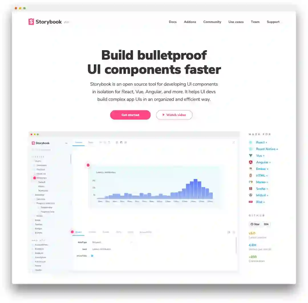 Storybook 是目前最受欢迎的 UI 组件环境,它为各种视图层(如 React、Vue、Angular、React Native、Ember)提供了结构化的 UI 开发、测试和文档。