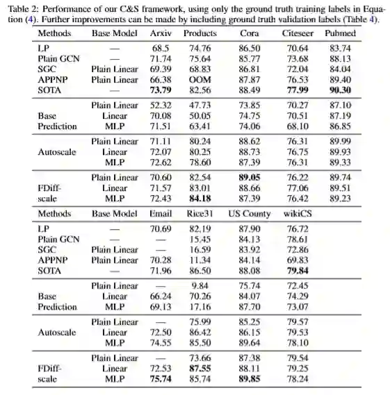 本文展示了许多标准的传导节点网络的分类基准结果,作者通过将忽略图结构的浅层模型与利用标签结构中相关性的两个简单后处理步骤相结合,可以超越或匹配SOTA的GNN的性能,这里主要有两个相关性(i)将训练数据中的残余误差带到测试数据中,用于矫正错误的“误差相关性”(error correlation),以及(ii)一个“预测相关性”,它可以平滑测试数据上的预测。本文称整个过程为矫正且平滑(Correct and Smooth, C&S),后处理步骤是通过对早期基于图的半监督学习方法的标准标签传导技术的简单修改来实现的。